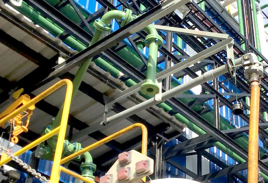 • Las conexiones giratorias poseen un diseño innovador: dentro de la conexión giratoria estructural, construida en acero revestido con TEFLON TEFZEL ETFE DE (0.3mm), existe un girarorio de PTFE solido, en contacto con el liquido. Esto hace que a la estructura mecánica del acero se le agregue la compatibilidad química del PTFE.